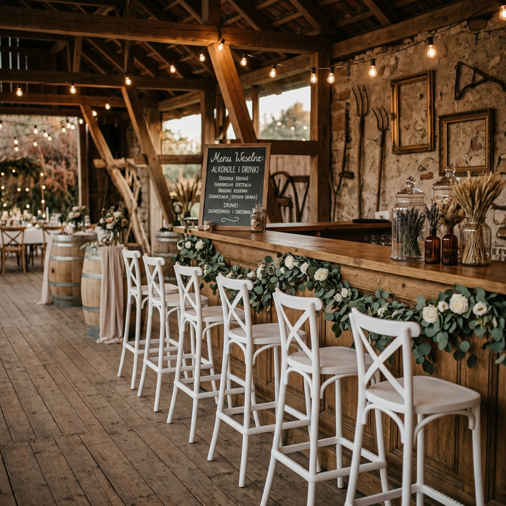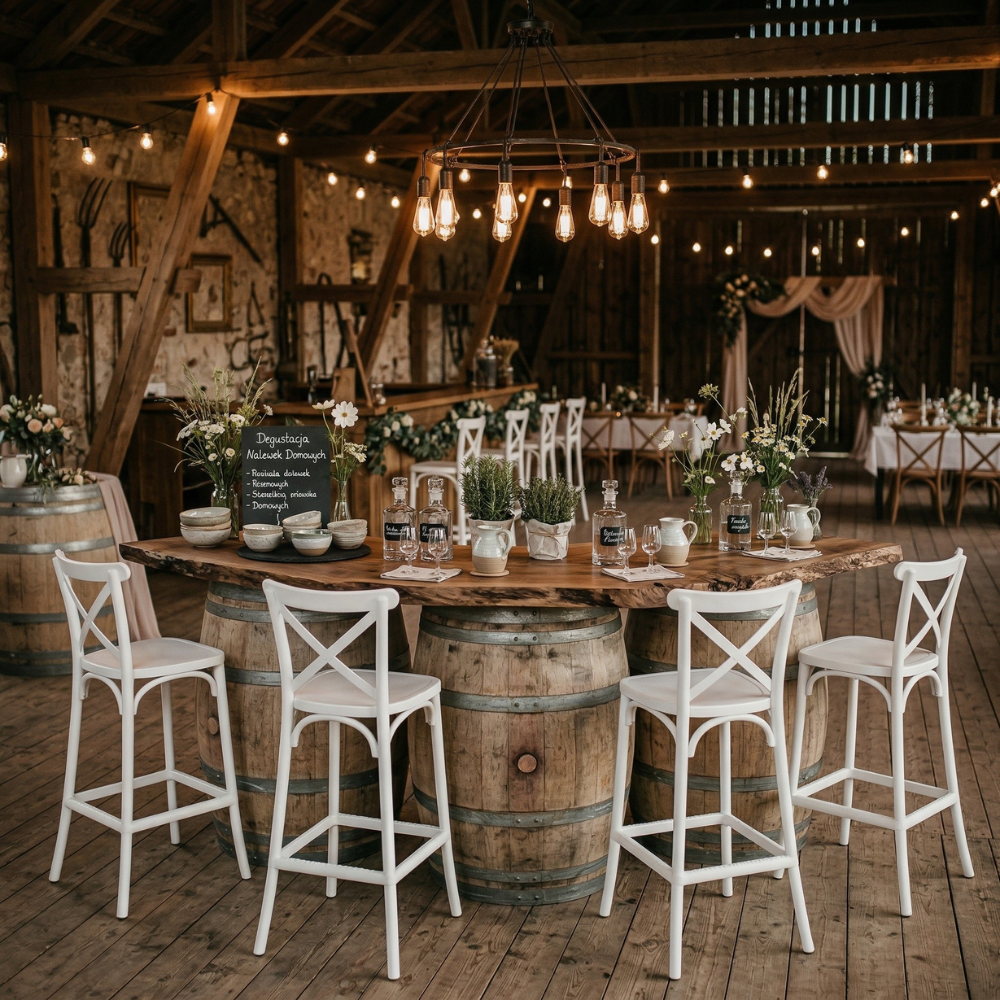 Białe hokery to niezwykle uniwersalny wybór – idealnie wpisują się w stylistykę boho, rustykalną, ślubną oraz klasyczną. Doskonale komponują się z drewnem, naturalnymi materiałami i zielenią, tworząc lekkie, przyjazne i eleganckie przestrzenie – szczególnie w aranżacjach plenerowych oraz weselnych.