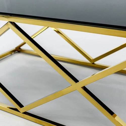 Luxed to linia ekskluzywnych stolików kawowych. Stelaż wykonany ze stali nierdzewnej w kolorze złotym, w połączeniu z czarnym szkłem hartowanym, stanowi idealne uzupełnienie każdej aranżacji w stylu Glamour lub nowoczesnym.